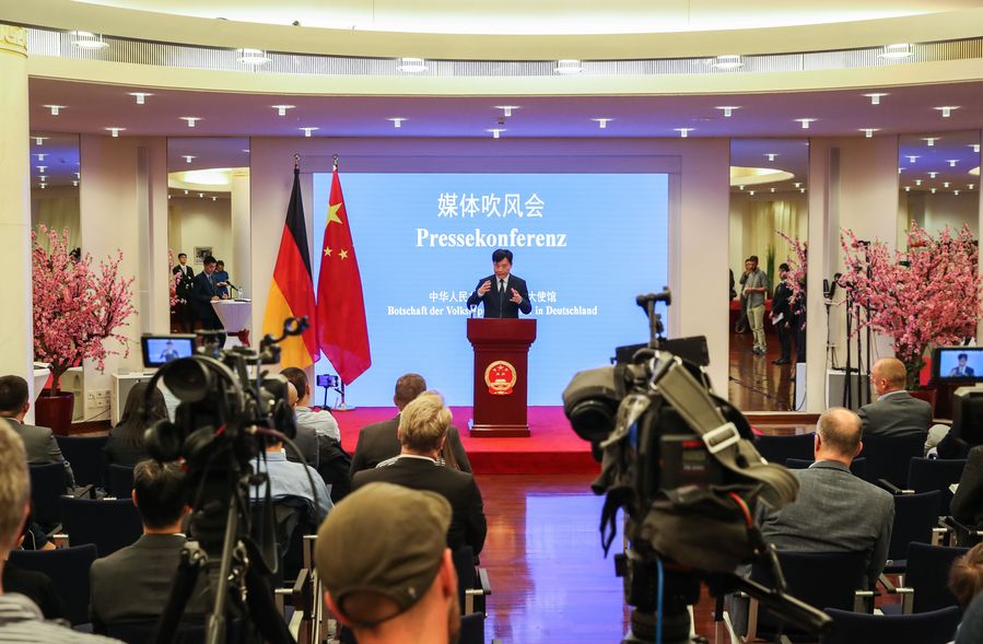 Chinese Ambassador to Germany Wu Ken attends a press conference at the Chinese Embassy in Berlin, capital of Germany, Sept. 11, 2019. (Xinhua/Shan Yuqi)