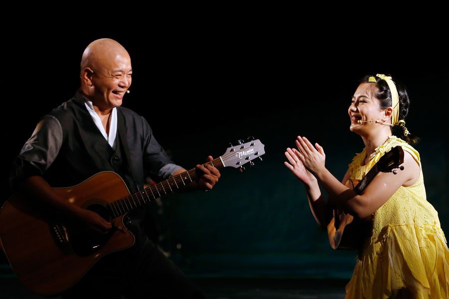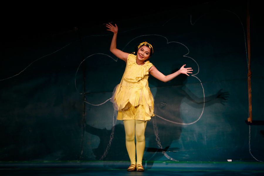 In the show, actress Tang Yan, in a yellow dress symbolizing the leaves, alternated narration with singing and onomatopoeic sessions such as baby's giggles and cat's miaows, making the young audience laugh. From time to time, she climbed down the stage to clap hands with the children sitting in different rows.