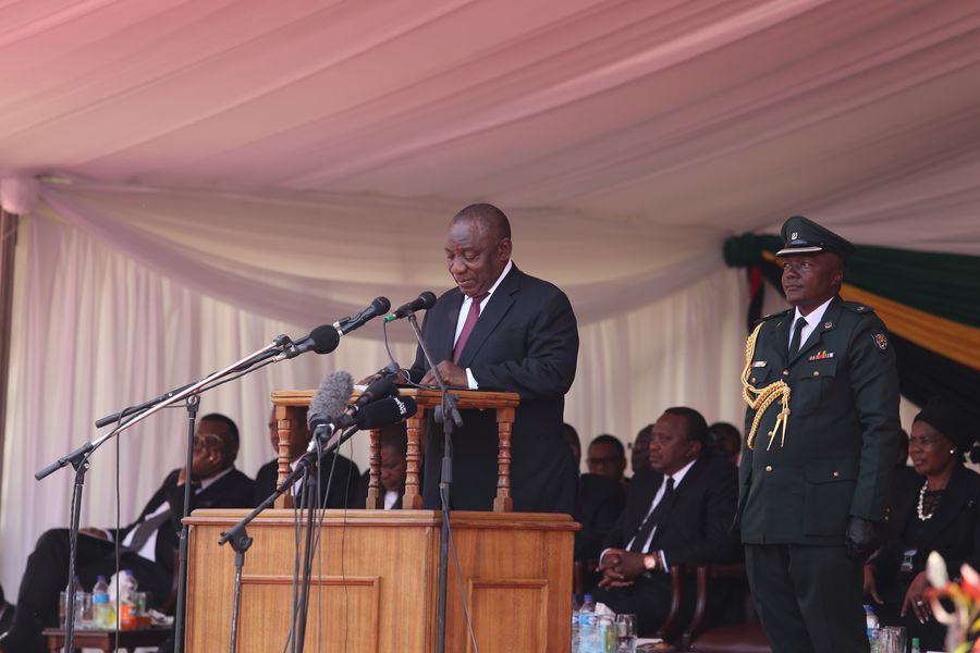 South African President Cyril Ramaphosa addresses Robert Mugabe's state funeral at the National Sports Stadium in Harare, Zimbabwe, on Sept. 14, 2019. (Xinhua/Chen Yaqin)