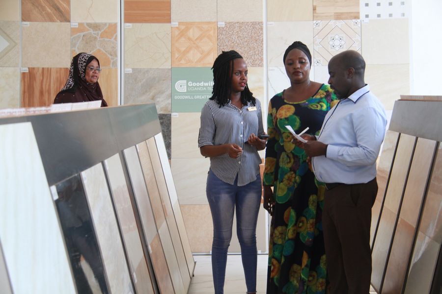 Customers look at the ceramic tile products at the ceramic tile exhibition hall of Goodwill (Uganda) Ceramic Co. Ltd in Kampala, Uganda, on Sept. 9, 2019. (Xinhua/Zhang Gaiping)