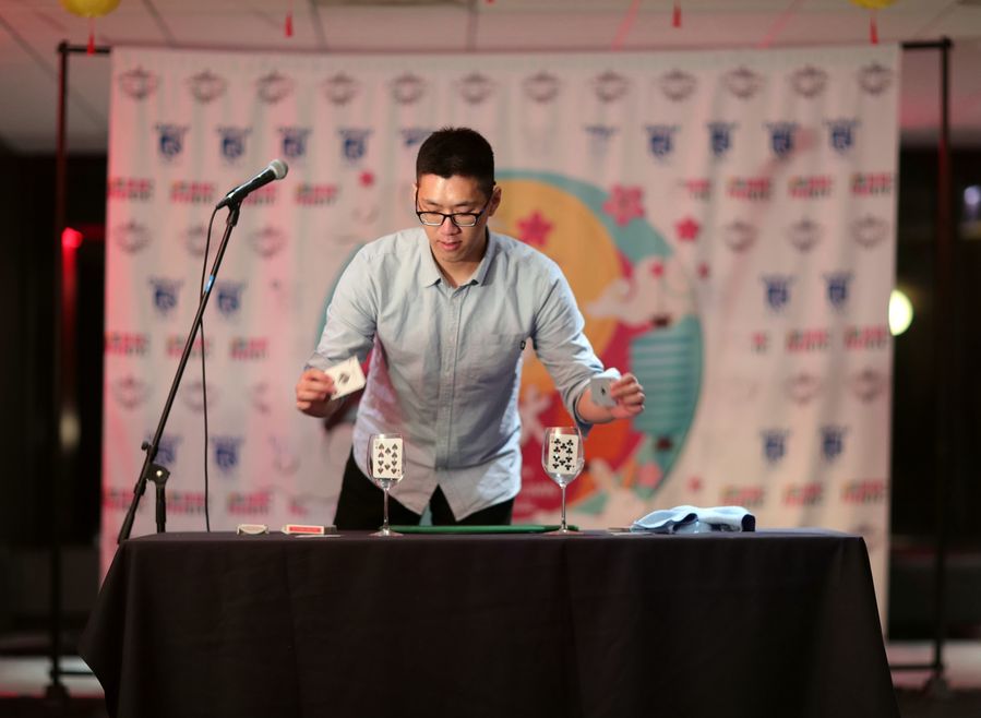 A Chinese student performs magic tricks at the Mid-Autumn Festival gala in Chicago, the United States, Sept. 14, 2019. (Xinhua/Wang Ping)