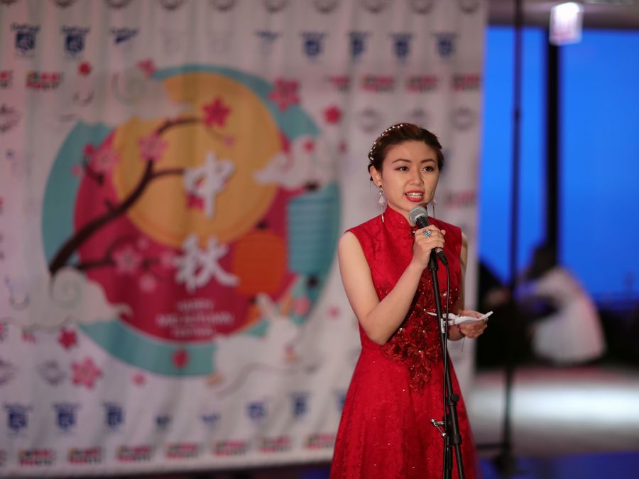 A hostess speaks during the Mid-Autumn Festival gala in Chicago, the United States, Sept. 14, 2019. (Xinhua/Wang Ping)