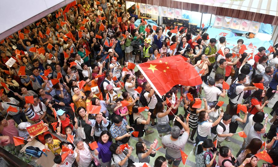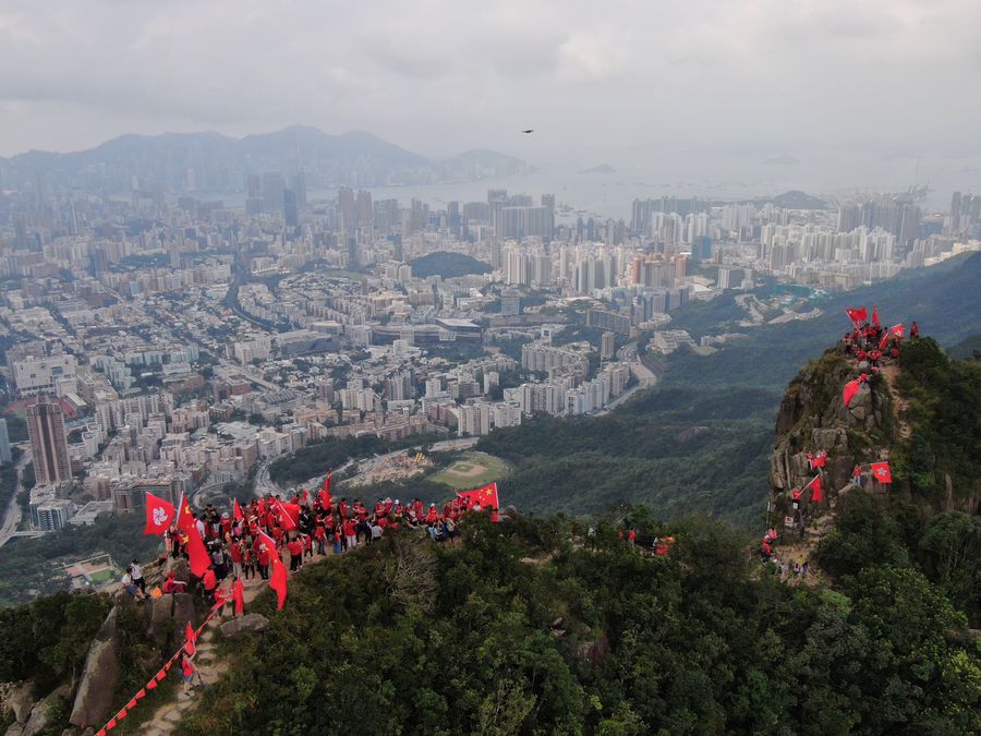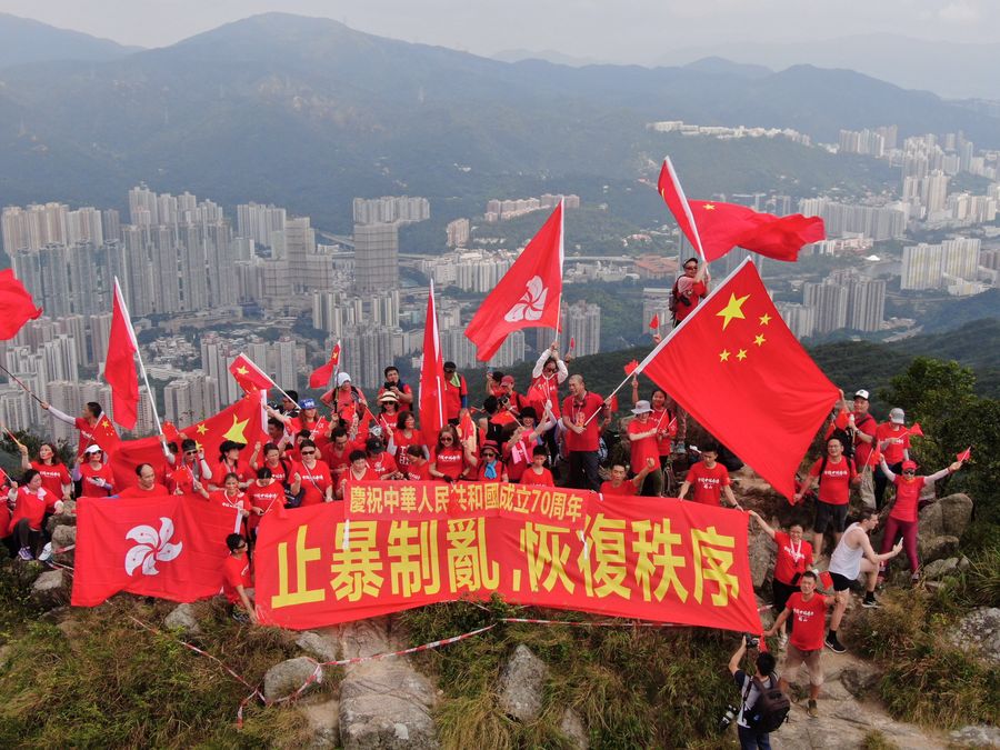 Residents wave China's national flag and the flag of the Hong Kong Special Administrative Region (SAR) at the peak of Lion Rock in Hong Kong, south China, Sept. 14, 2019.(Xinhua/Lui Siu Wai)