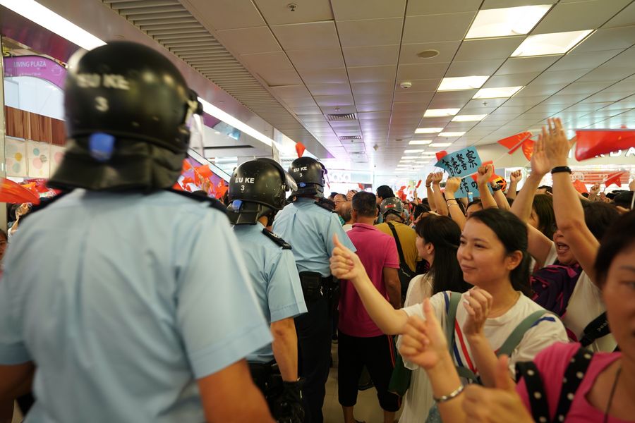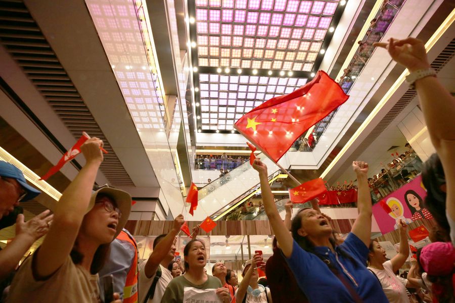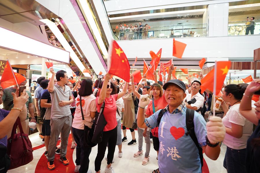 Residents gather at the Amoy Plaza in Kowloon, who sing China's national anthem to show their support to a teacher beaten by protesters for singing that song days ago, in Hong Kong, south China, Sept. 14, 2019.(Xinhua/Lu Hanxin)