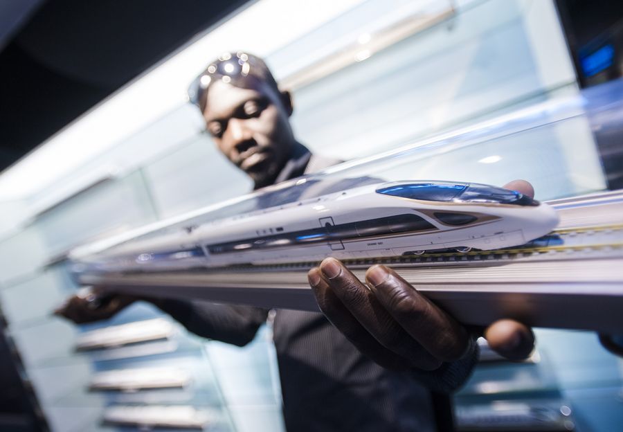 A railway executive from Ghana watches a model of Fuxing bullet train at a training base for high-speed railway staff in Wuhan, central China's Hubei Province, June 12, 2018. (Xinhua/Xiao Yijiu)