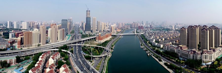 Stitched aerial photo taken on June 26, 2019 shows the view of the Haijin Bridge on the Haihe River in north China's Tianjin. (Xinhua/Yue Yuewei)