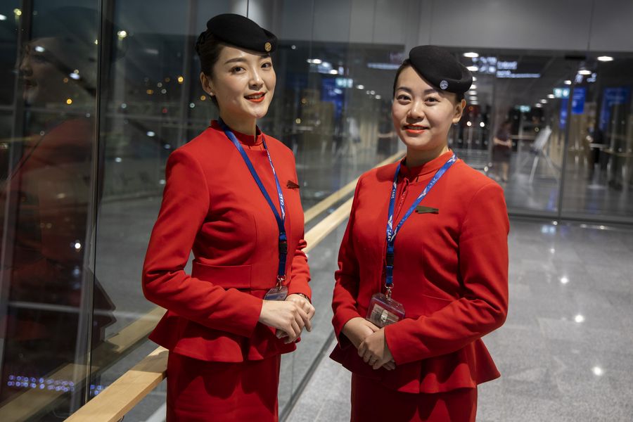 Two cabin crew members of the Sichuan Airlines pose for photos at the Helsinki-Vantaa Airport in Helsinki, Finland, on Sept. 16, 2019. (Photo by Matti Matikainen/Xinhua)
