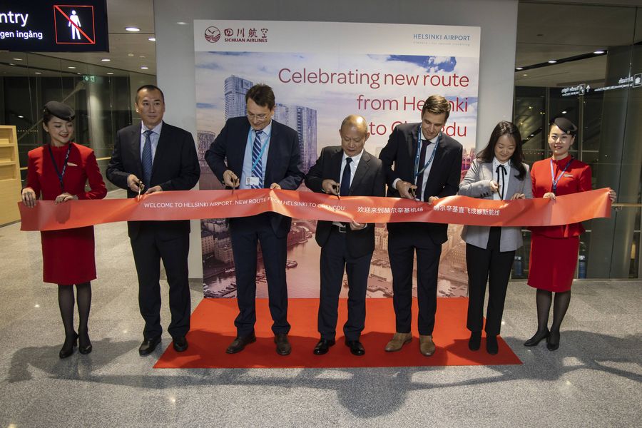 Representatives of the Sichuan Airlines and Finavia, or the Finnish Airport Operator, cut ribbon at the Helsinki-Vantaa Airport in Helsinki, Finland, on Sept. 16, 2019. (Photo by Matti Matikainen/Xinhua)■