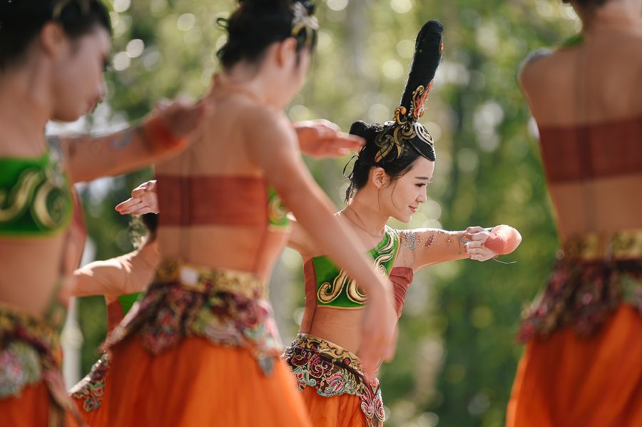 Artists dance during the China Festival in VDNKh park in Moscow, Russia, on Sept. 14, 2019. The China Festival features Peking Opera, Chinese classical music shows and other cultural performances. (Photo by Evgeny Sinitsyn/Xinhua)