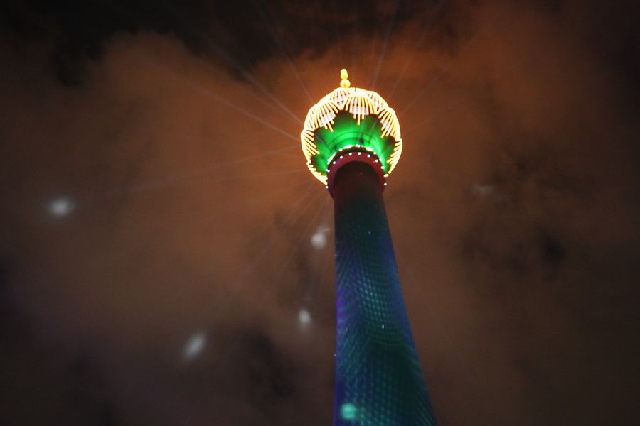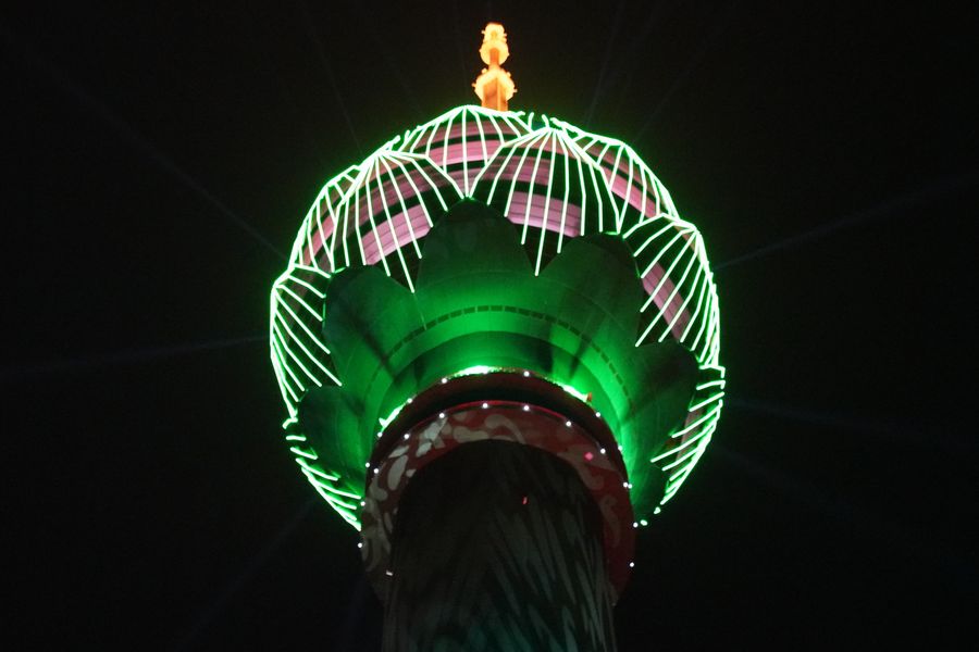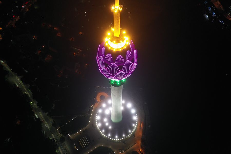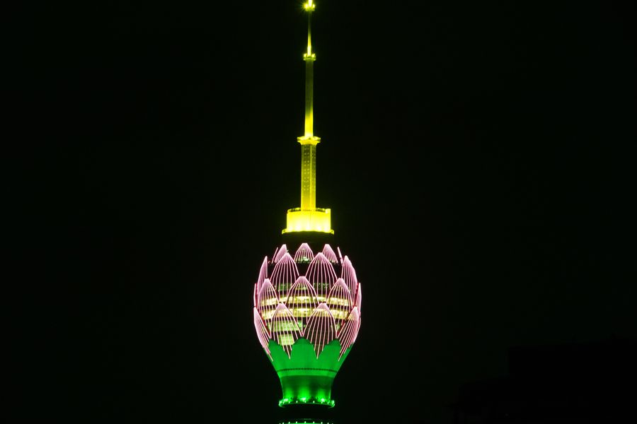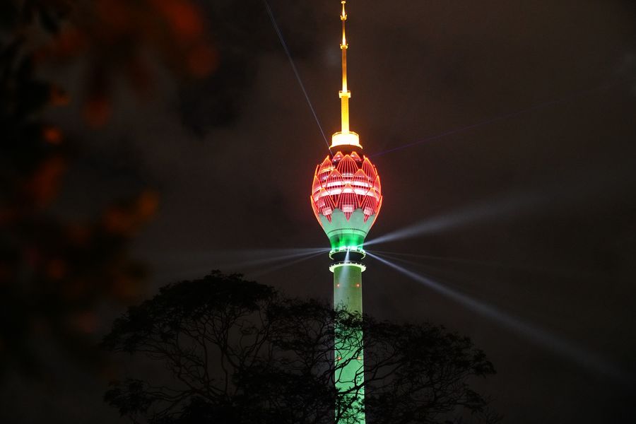 Photo taken on Sept. 16, 2019 shows the Lotus Tower and its light show in Colombo, Sri Lanka. (Xinhua/Tang Lu)