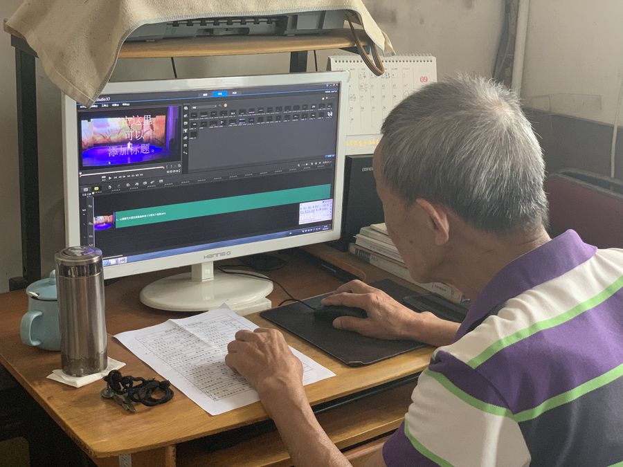 Zhu Yuanliang learns how to use video editing software and edits videos by himself in Changsha, central China's Hunan Province, Sept. 5, 2019. (Xinhua/Zhang Yujie)