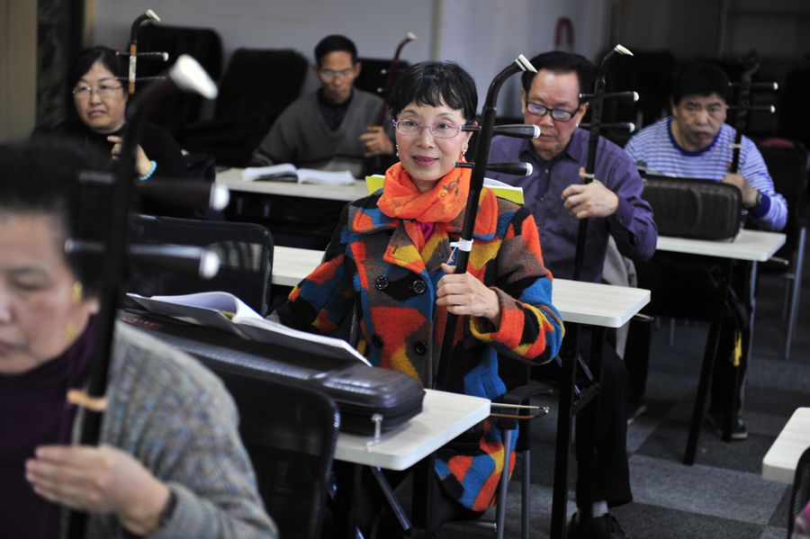 Students from "Happy Elderly College" learn to play erhu in Changsha, central China's Hunan Province, Nov. 28, 2018. (Xinhua/Li Lindong)
