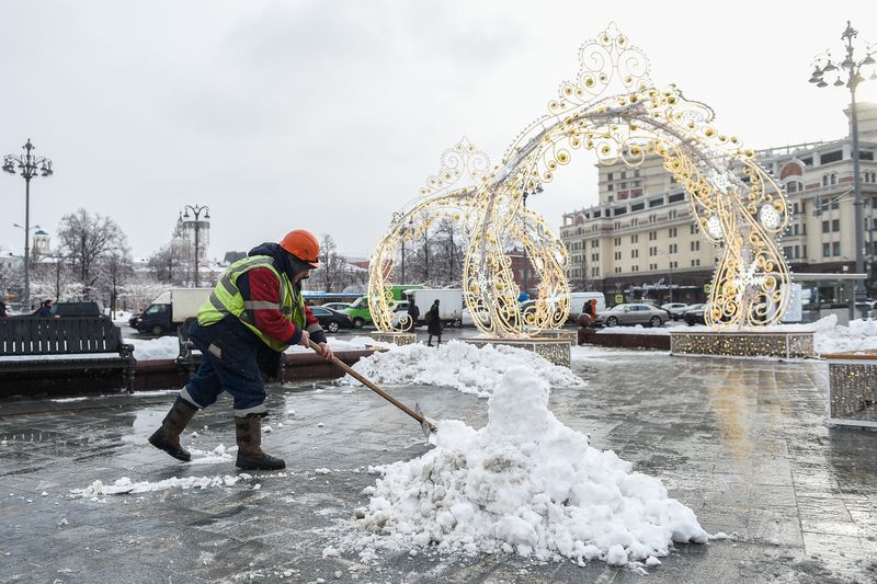 A worker clears snow in Moscow, Russia, on Feb. 13. 2019. (Xinhua/Evgeny Sinitsyn)