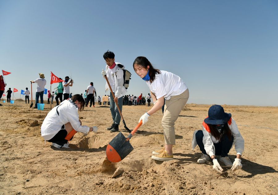 Volunteers plant trees sponsored by the Ant Forest initiative in a gobi desert in Dunhuang City, northwest China's Gansu Province on April 22, 2019. (Xinhua/Xu Kangping)