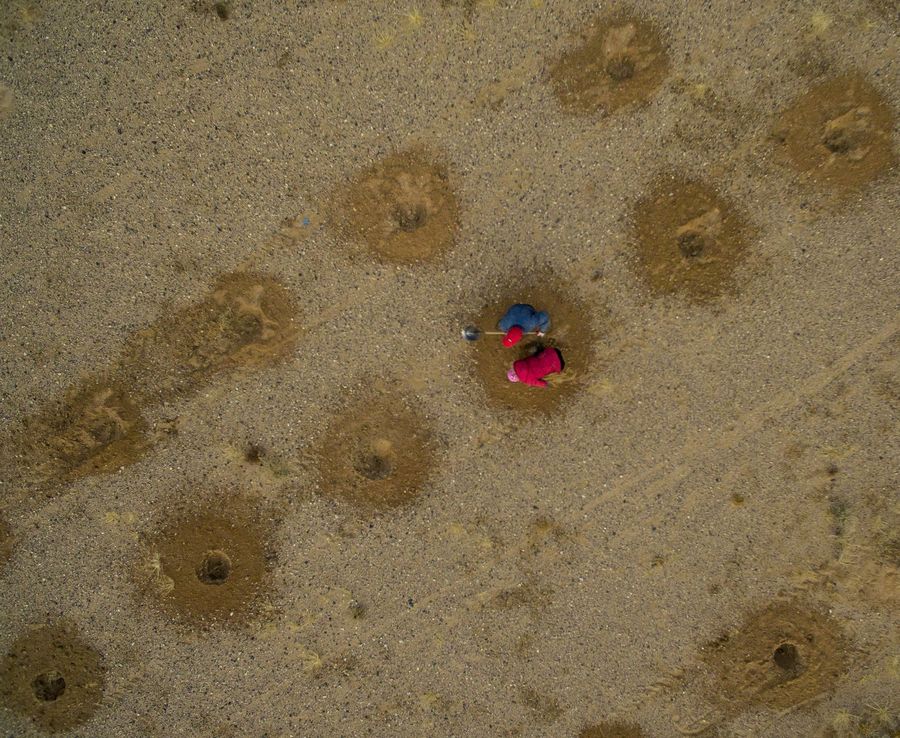 Workers plant trees sponsored by the Ant Forest initiative at an arid pasture in north China's Inner Mongolia Autonomous Region on March 20, 2017. (Xinhua/Shen Bohan)