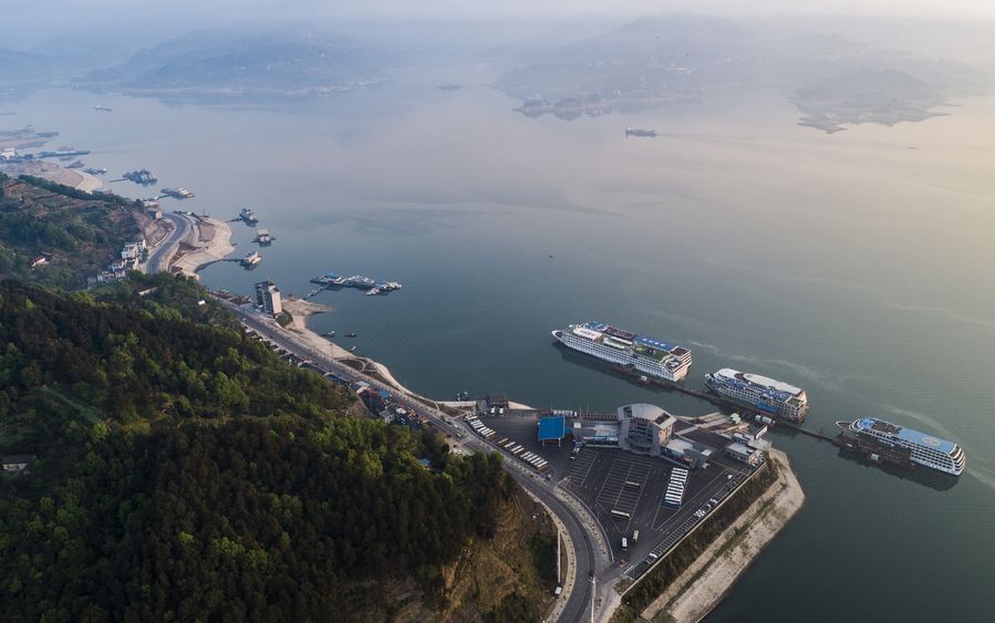Aerial photo taken on April 8, 2019 shows the scenery of Zigui port, which is located at the upper reaches of the Three Gorges Dam, in Zigui county, central China's Hubei Province. (Xinhua/Zheng Jiayu)