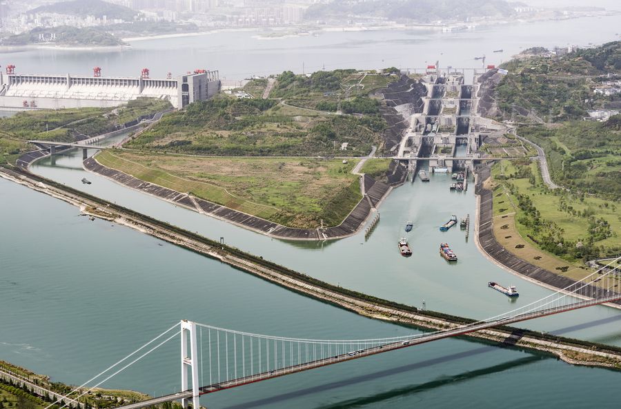 Cargo vessels enter the five-tier ship lock at the Three Gorges Dam on the Yangtze River, April 6, 2018. (Xinhua/Zheng Jiayu)