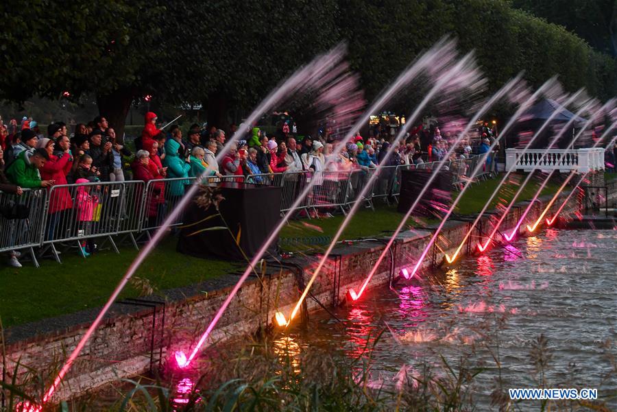 People admire the Wandering Lights Festival at Kadriorg Park of Tallinn, capital of Estonia, on Sept. 19, 2019. The festival was held at both Kadriorg Park and Tallinn Old Town on Thursday night, as the city's 14th light festival. (Photo by Sergei Stepanov/Xinhua)