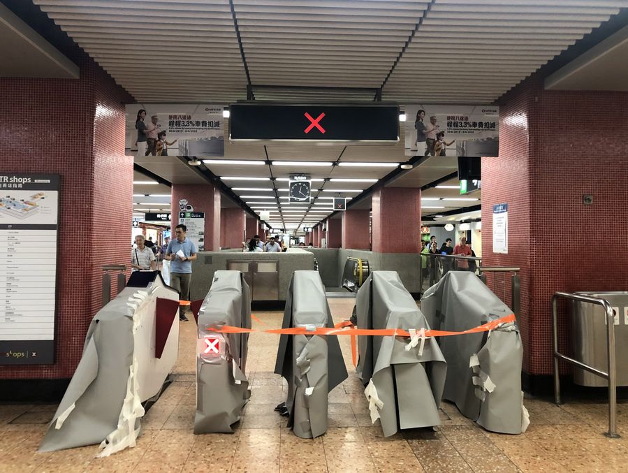 Damaged turnstiles at the MTR Mong Kok Station in south China's Hong Kong, Sept. 9, 2019. (Xinhua)