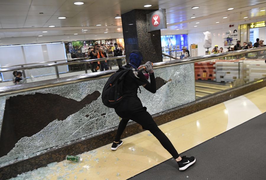 A rioter vandalizes the mass transit railway (MTR) Admiralty station in Hong Kong, south China, Sept. 15, 2019. (Xinhua)