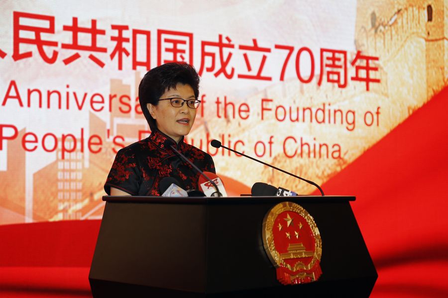 Romanian Prime Minister Viorica Dancila addresses China's National Day reception at the Chinese Embassy in Romania in Bucharest, capital of Romania, on Sept. 19, 2019.(Photo by Cristian Cristel/Xinhua)