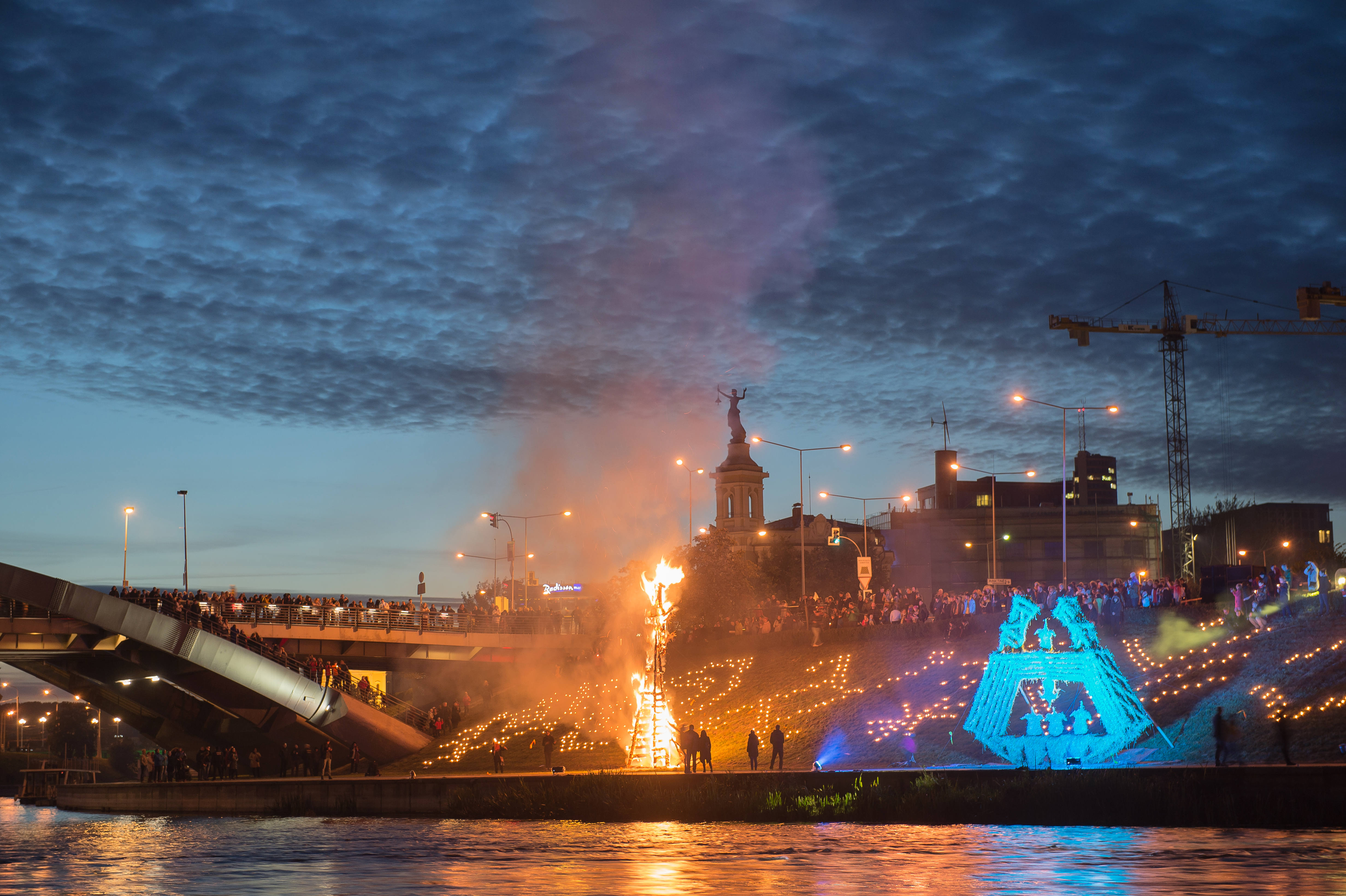 People attend the celebration of autumn equinox on the embankment of Neris river in Vilnius, Lithuania, on Sept. 20, 2019. People celebrated autumn equinox here with the burning of straw sculptures of mythological creatures and various fire shows on Friday. (Photo by Alfredas Pliadis/Xinhua)