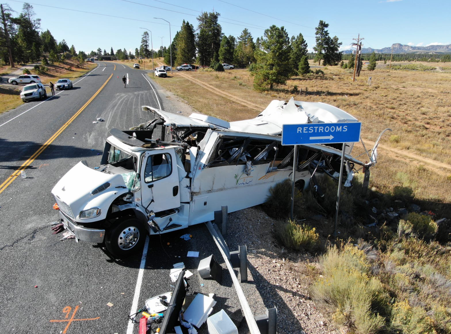 Photo provided by Utah Highway Patrol on Sept. 20, 2019 shows the bus crash scene near the Bryce Canyon National Park in Utah, the United States. At least four Chinese speaking tourists were confirmed dead in a tour bus crash near Bryce Canyon National Park in U.S. state of Utah on Friday, according to Utah Highway Patrol. (Utah Highway Patrol/Handout via Xinhua)