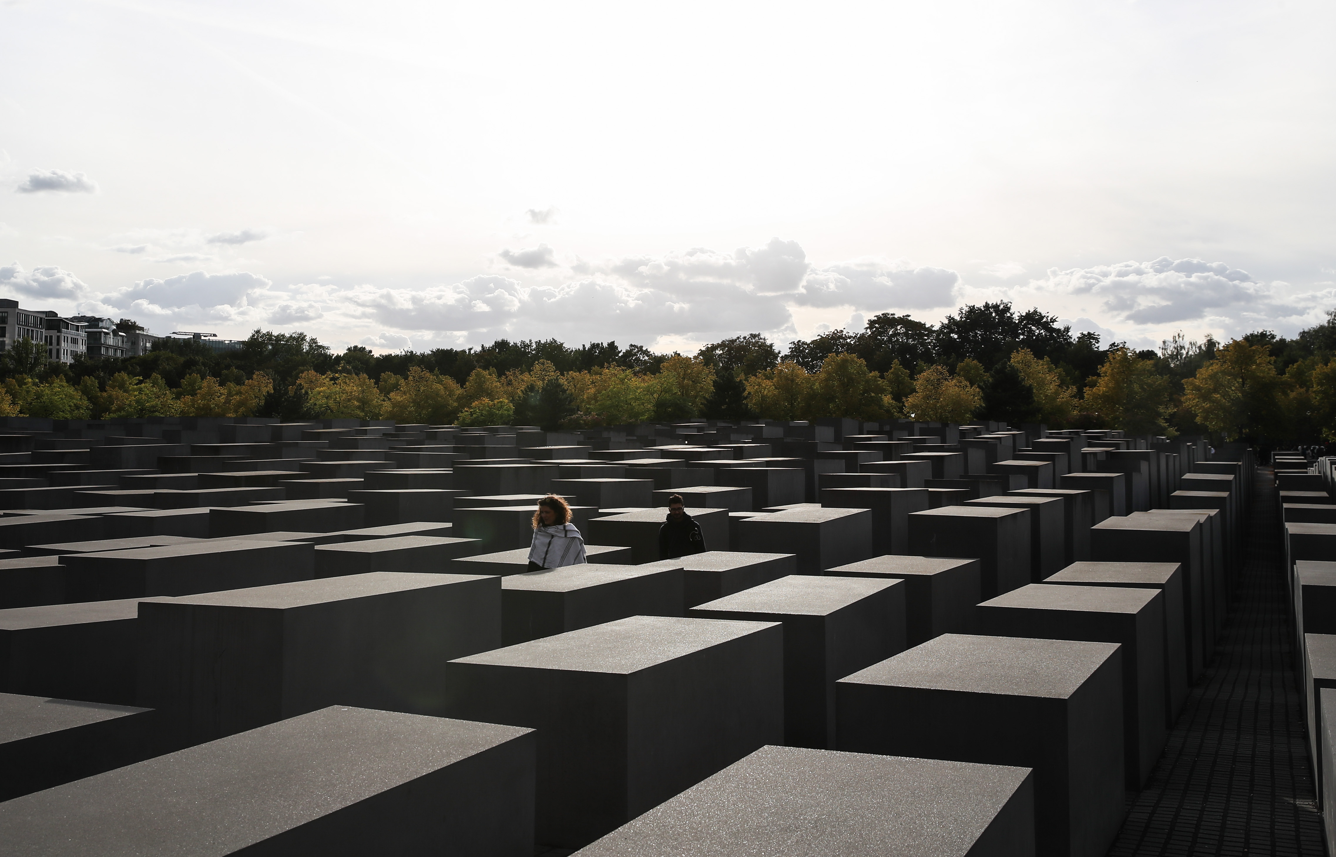 A man and a woman walk across the Memorial to the Murdered Jews of Europe in Berlin, capital of Germany, Sept. 19, 2019. (Xinhua/Shan Yuqi)