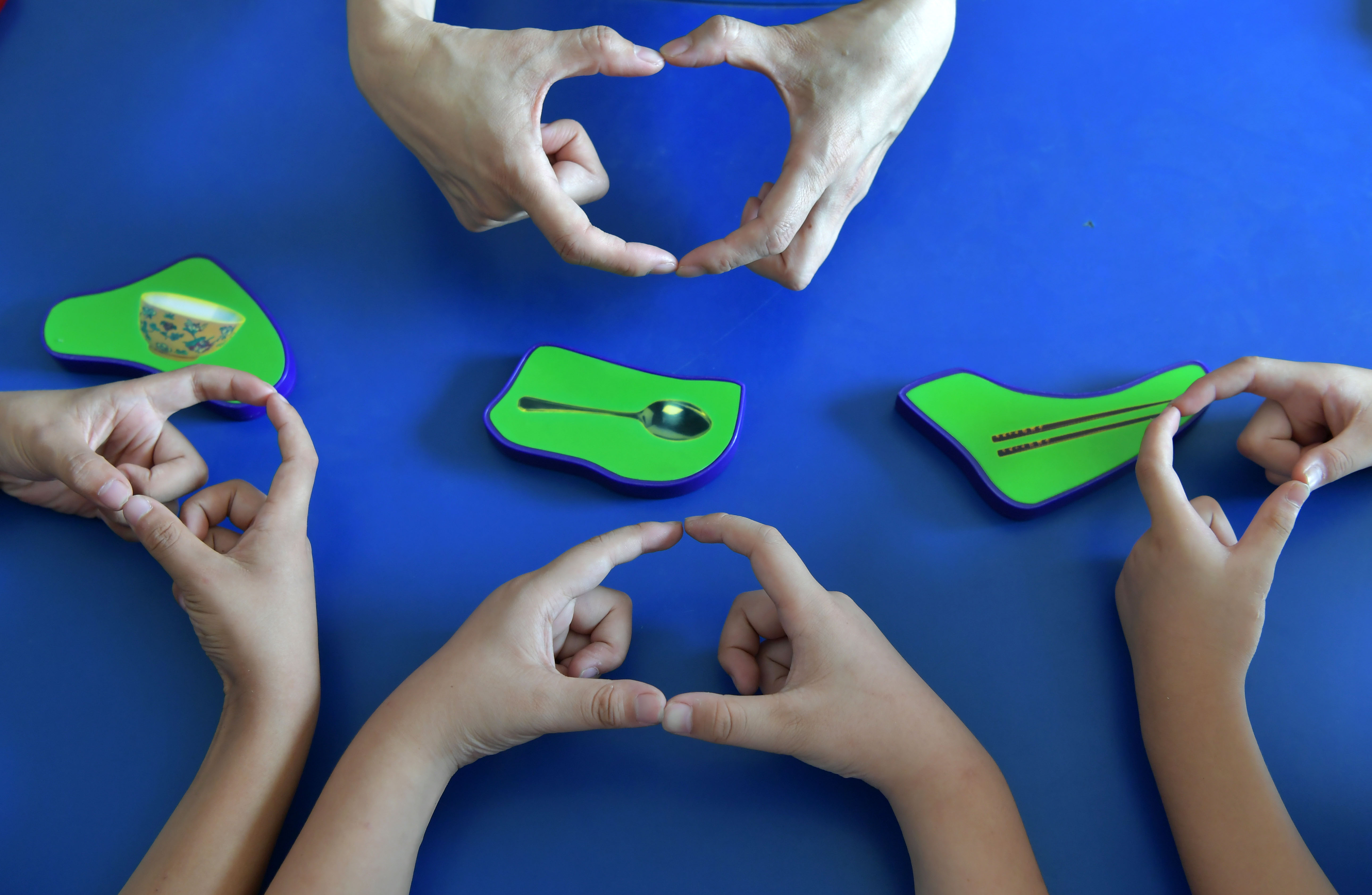 Zhang Li teaches sign language to students at Qi Yin School in Nanchang, capital of east China's Jiangxi Province, Sept. 18, 2019. Zhang Li, who has worked on special education for 33 years, was recognized as a national teaching model in 2019 on this year's Teacher's Day. Zhang, moved by a dancing of a girl with deafness on TV, decided to work at the Qi Yin School in Nanchang to teach students with hearing problems after she graduated, and finally became the principal of the school. (Xinhua/Peng Zhaozhi)