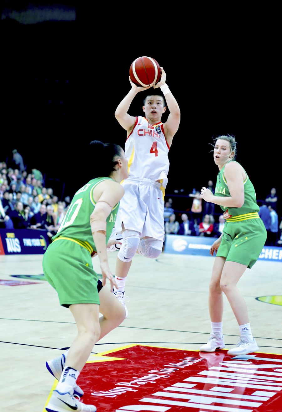 Li Yuan (C) of China shoots the ball during a friendly women basketball match between China and Australia in Canberra, Australia on Sept. 19, 2019. (Photo by Chu Chen/Xinhua)