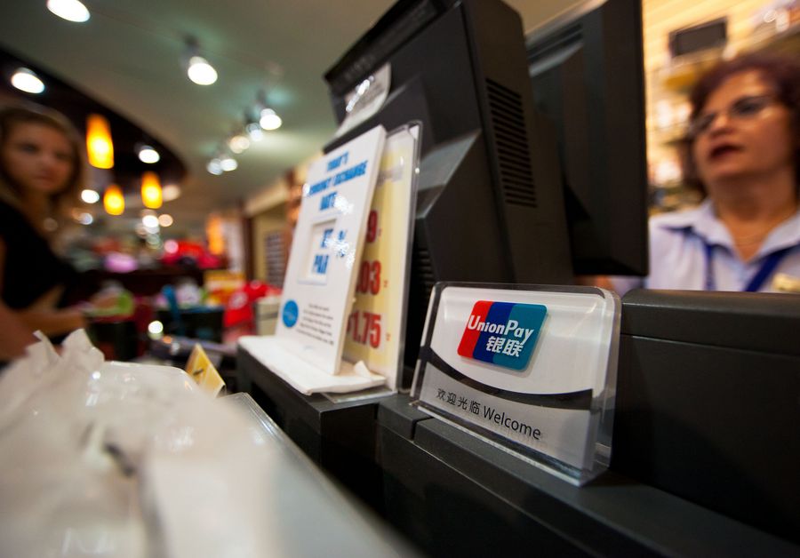 The sign of China Unionpay is seen at a shop in Niagara Falls, Ontario, Canada, on Aug. 18, 2011.(Xinhua/Zou Zheng)