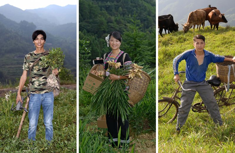 Combo photo (L to R) shows Zhang Hui posing in a peanut field in Dongping Town of Anhua County; Shi Qiushi, who is a primary school teacher, harvesting ginger in Longcheng Town of Tongdao Dong Autonomous County; and Yang Xiuqian posing on a mountain pasture in Shuangjiang Town of Tongdao Dong Autonomous County. (Xinhua/Li Ga)