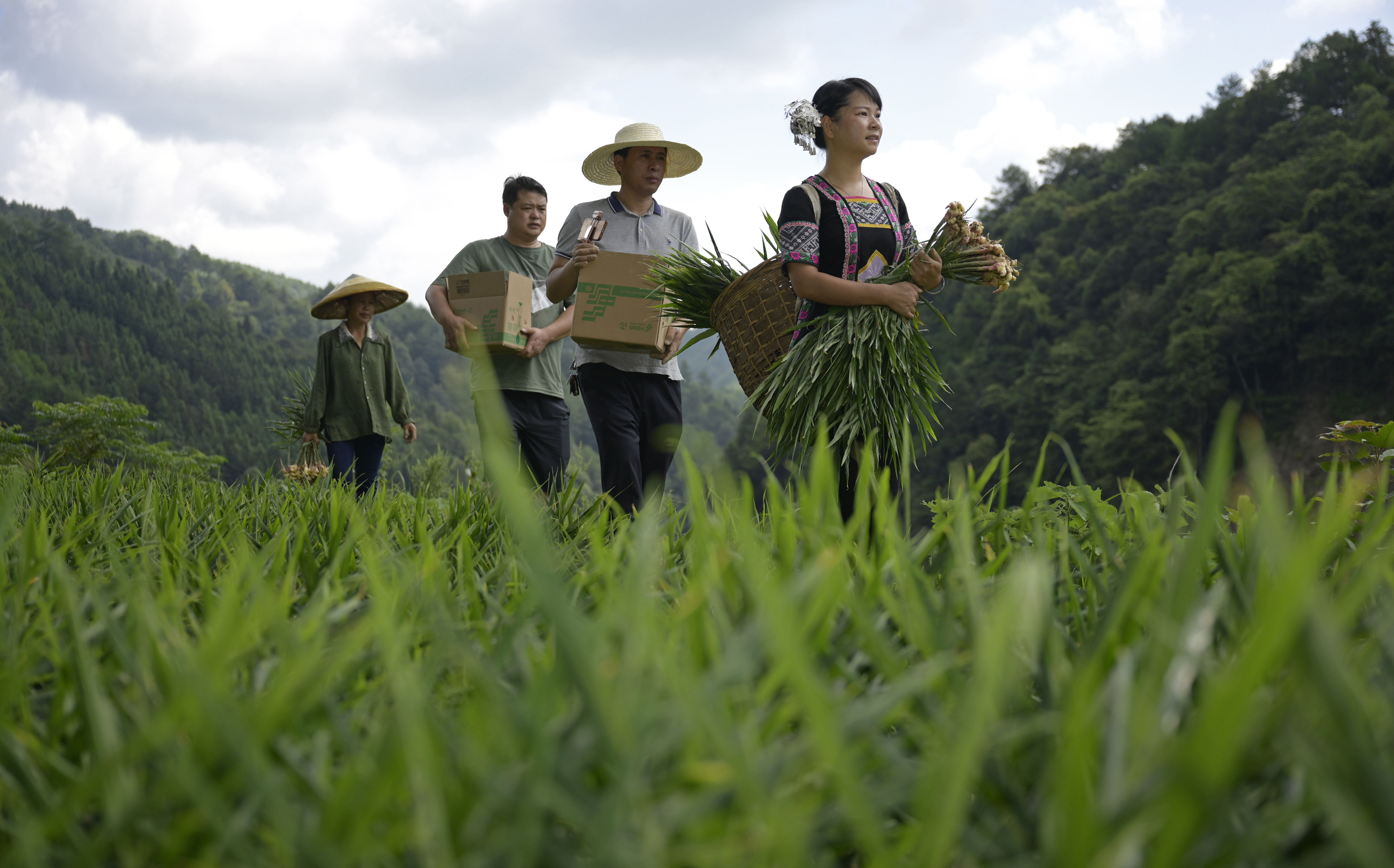 Shi Qiushi (R), a primary school teacher, harvests ginger in Longcheng Town of Tongdao Dong Autonomous County, central China's Hunan Province. With over 2.2 million fans on the Internet, Shi Qiushi helps local famers to sell agricultural products through video and broadcast during her spare time. (Xinhua/Li Ga)