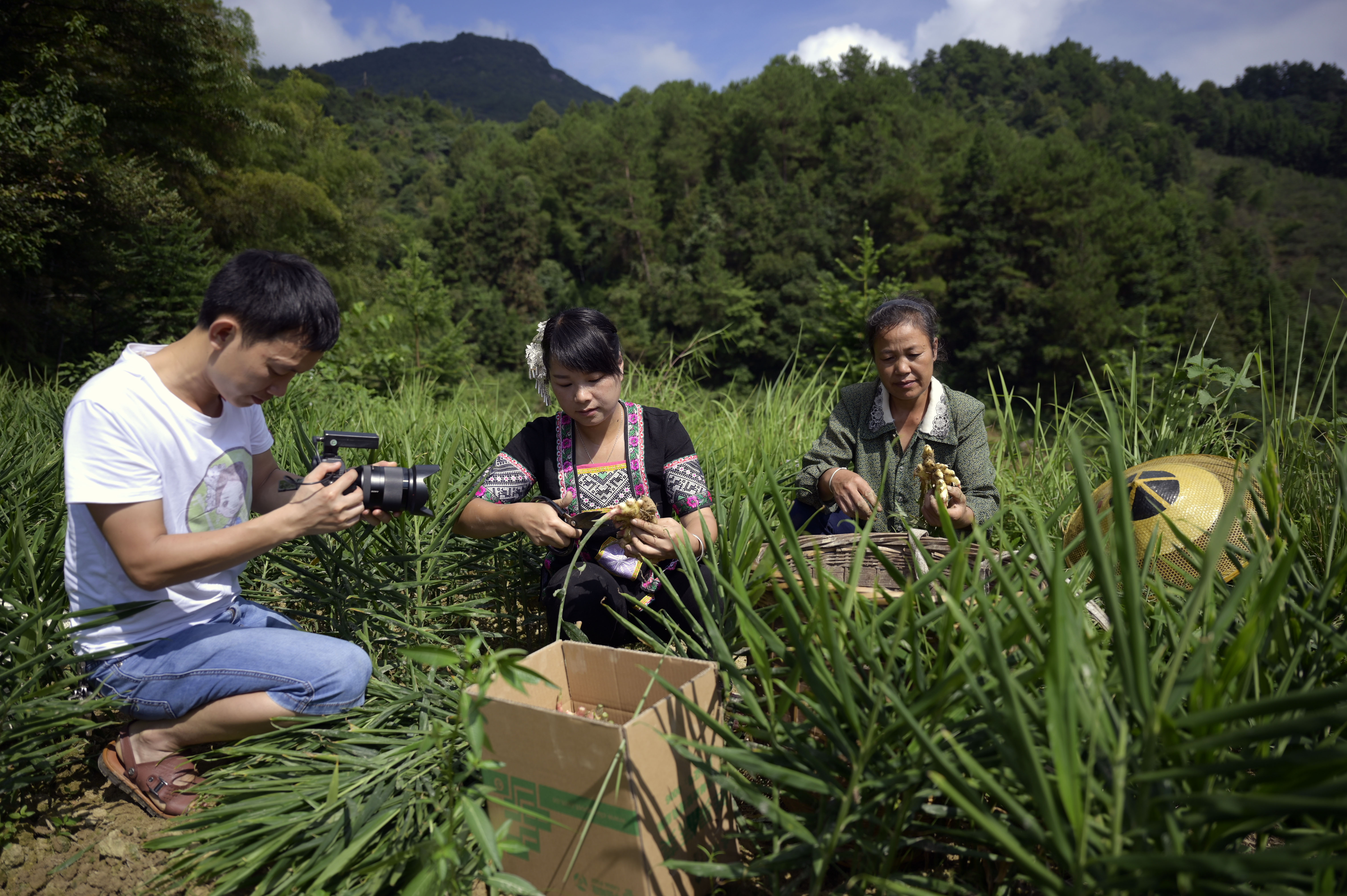 Shi Qiushi (C), a primary school teacher, records videos of harvesting ginger with farmer in Longcheng Town of Tongdao Dong Autonomous County, central China's Hunan Province. (Xinhua/Li Ga)