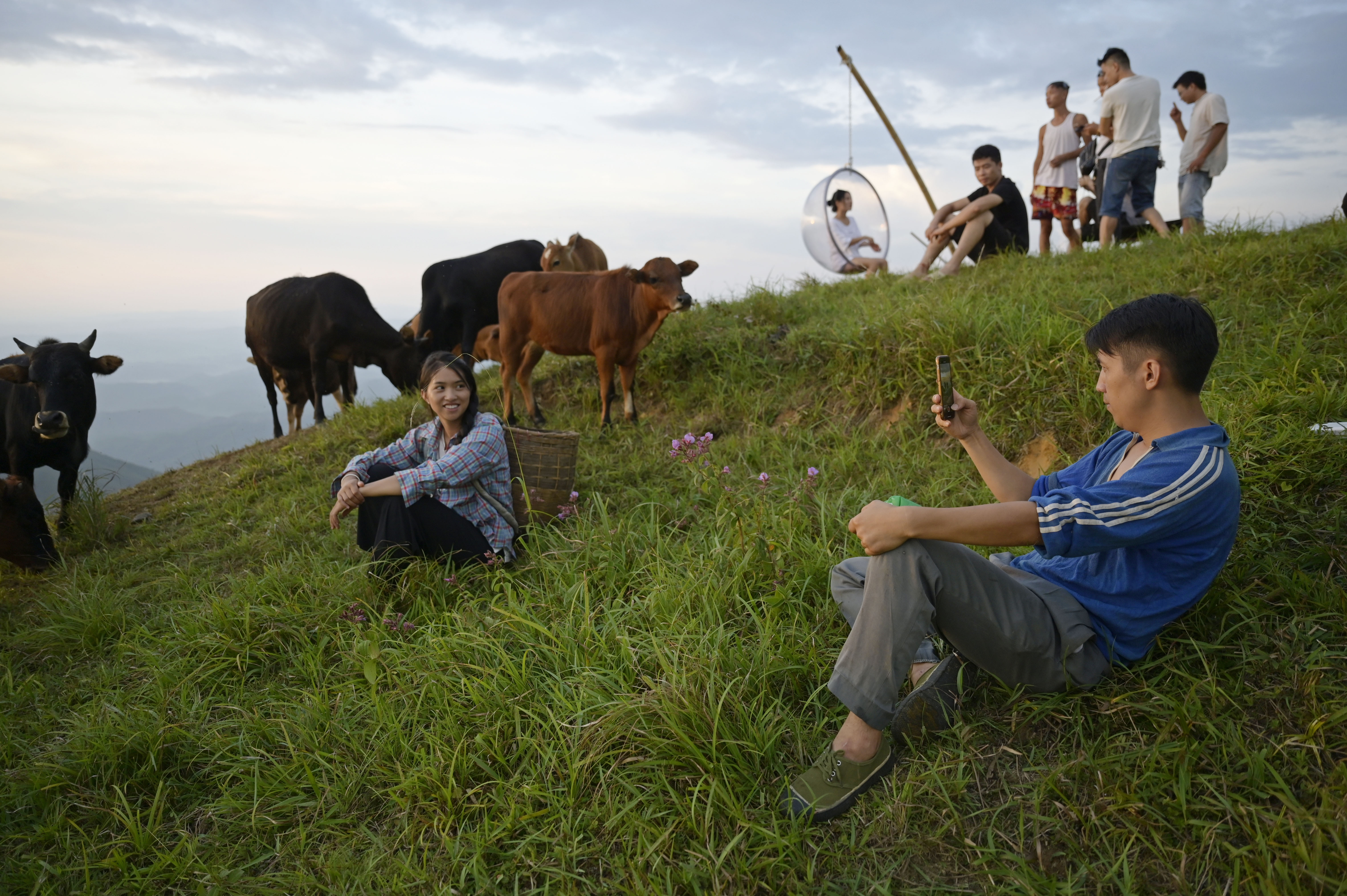 Yang Xiuqian (R, front) records videos on a mountain pasture in Shuangjiang Town of Tongdao Dong Autonomous County, central China's Hunan Province. With over 800,000 fans on the Internet, Yang Xiuqian is a rural Internet talent who likes to record rural life videos to promote local specialties. (Xinhua/Li Ga)