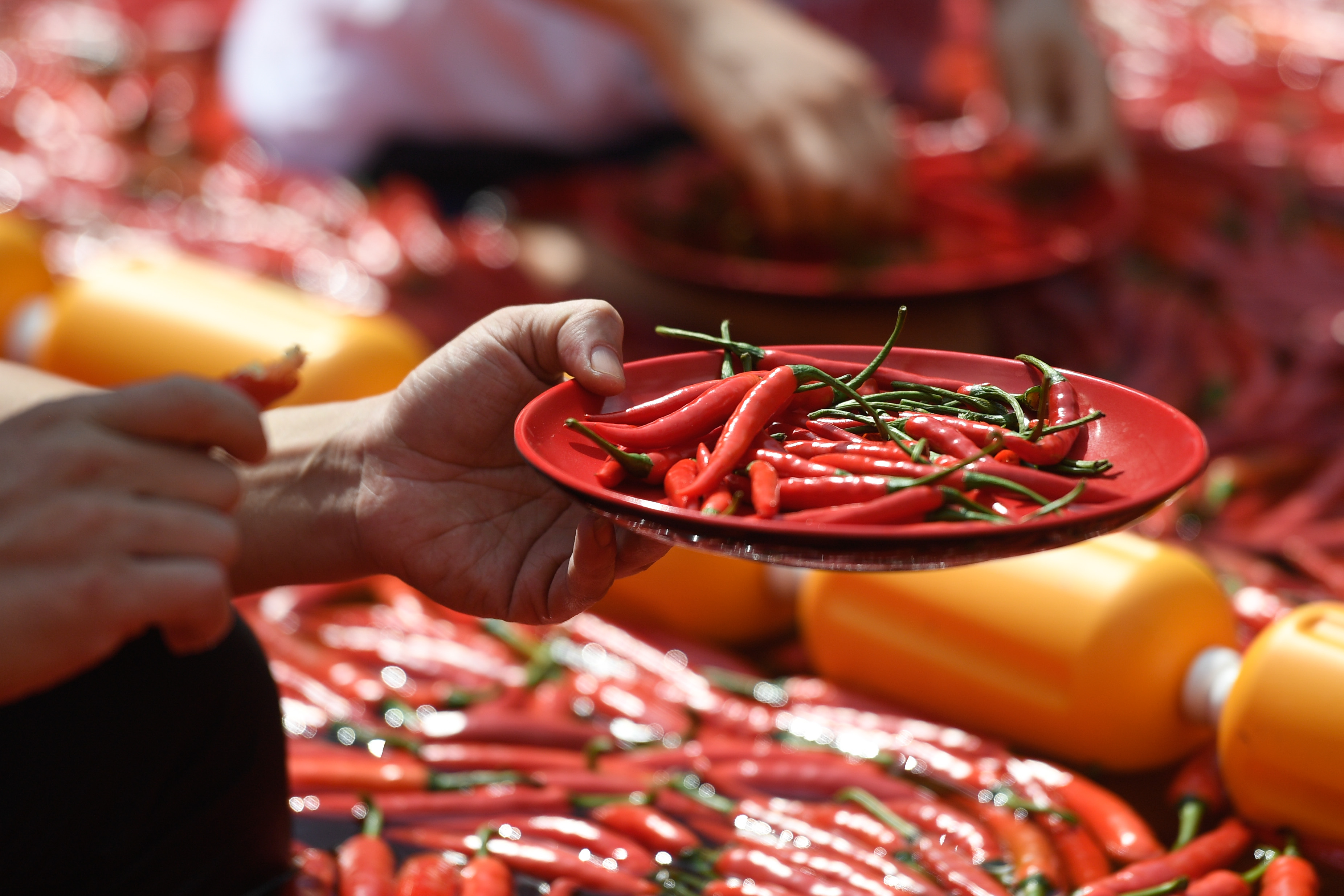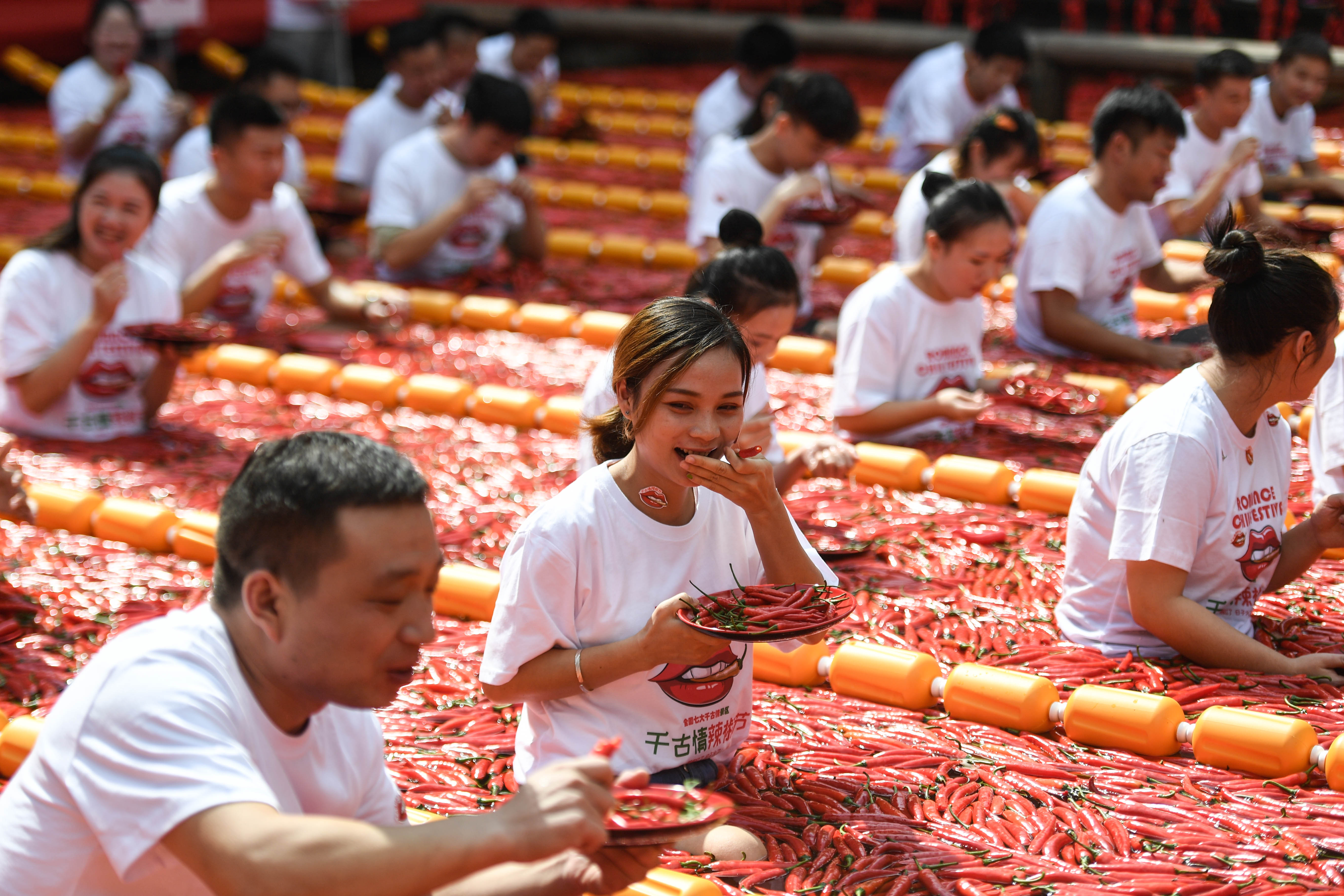 Hot, hot, hot! Contestants sit in a large chili pool and take part in a fierce chili eating competition in east China's Zhejiang.