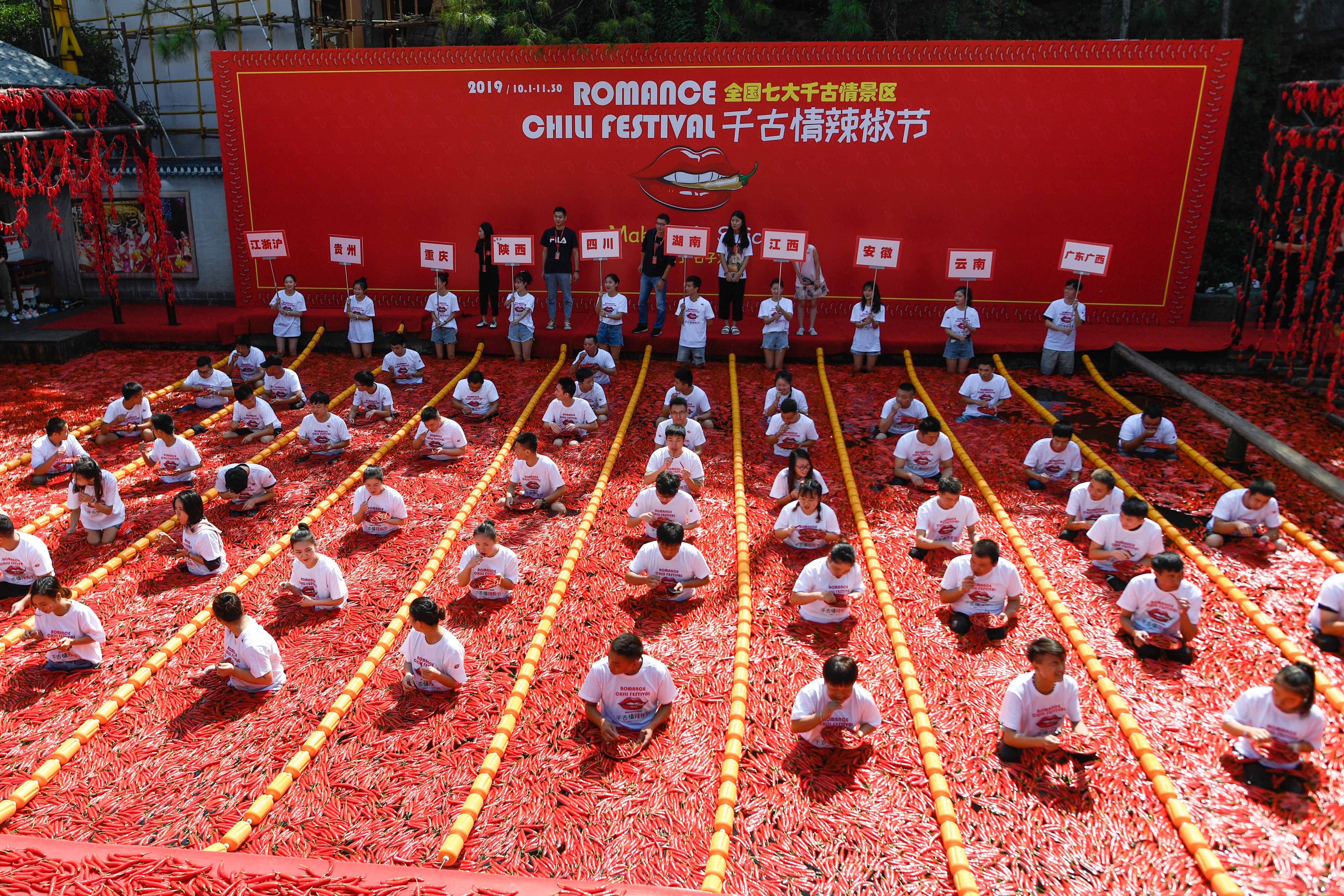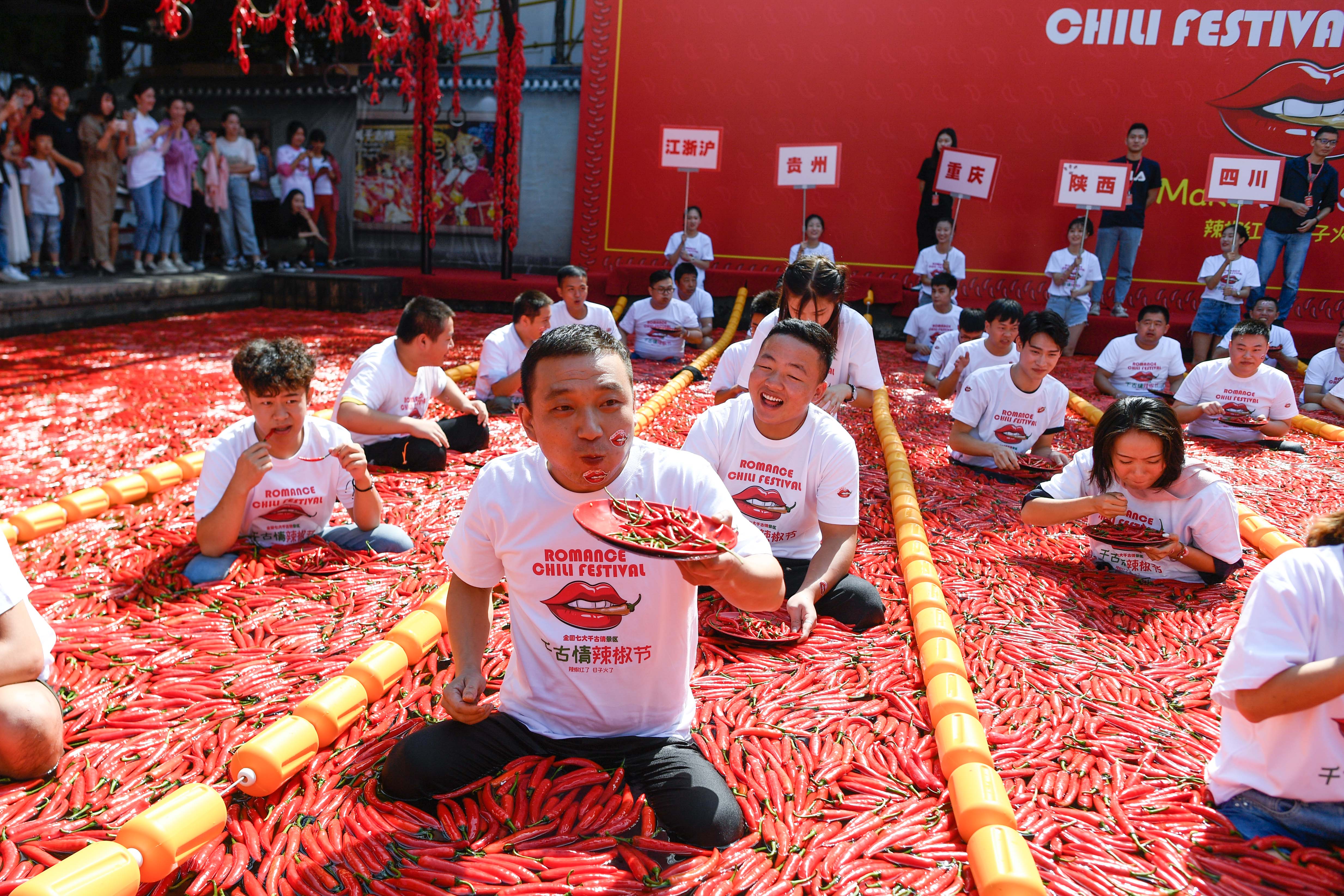 Invited tourists participate in a chili eating competition at Songcheng scenic area in Hangzhou, east China's Zhejiang Province, Sept. 22, 2019. (Xinhua/Huang Zongzhi)