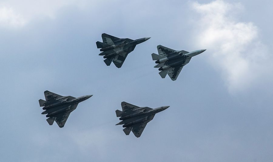 Photo taken on Aug. 27, 2019 shows Su-57 fighter jets on the international aviation and space salon MAKS 2019 in Zhukovsky, Russia. (Xinhua/Bai Xueqi)
