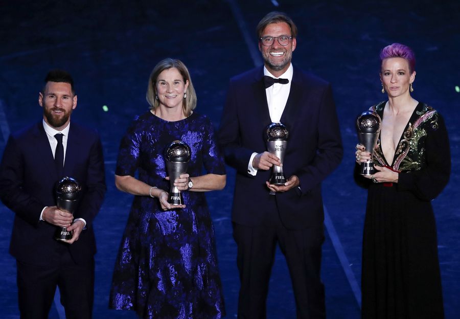 Rapinoe beat fellow World Cup winner Alex Morgan and England's Lucy Bronze to the women's title, with US coach Jill Ellis winning women's coaching award.