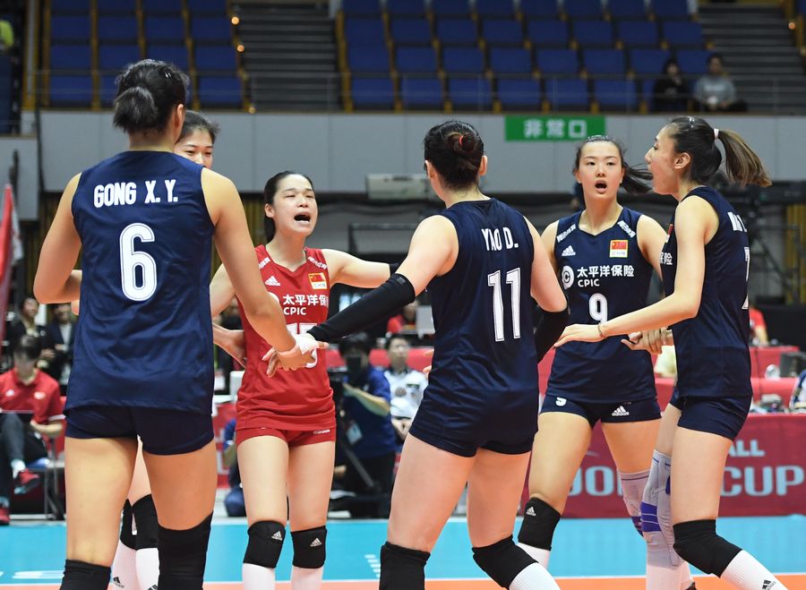 Players of China celebrate during the Round Robin match between China and Kenya at the 2019 FIVB Women's World Cup in Sapporo, Japan, Sept. 24, 2019. (Xinhua/He Canling)