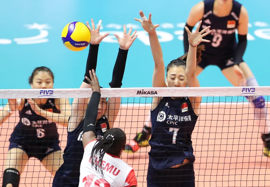 Yao Di (2nd L) and Wang Yuanyuan (R) of China block the ball during the Round Robin match between China and Kenya at the 2019 FIVB Women's World Cup in Sapporo, Japan, Sept. 24, 2019. (Xinhua/Du Xiaoyi)