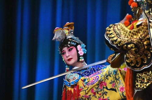 Man Xutong (Front) performs a Peking opera during a gala in Chicago, the United States, on Sept. 15, 2019.(Xinhua)