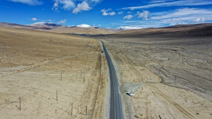 Aerial photo taken on June 14, 2019 shows the construction site of a highway linking Bulungkol with Kunjirap in northwest China's Xinjiang Uygur Autonomous Region. (Xinhua/Hu Huhu)