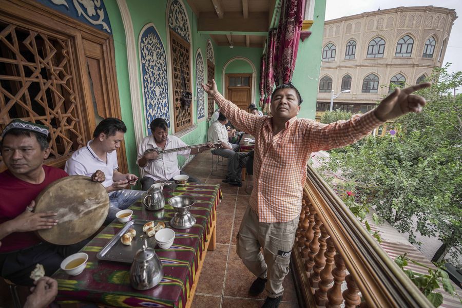 A local resident dances to the music at a tea house in the ancient city of Kashgar, northwest China's Xinjiang Uygur Autonomous Region, July 7, 2019. (Xinhua/Zhao Ge)