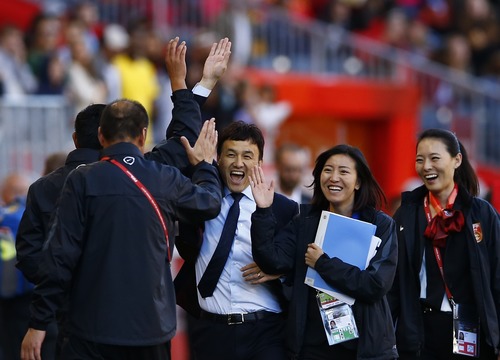 Hao Wei was celebrating with his coaching staff after China finished second in the group stage of the 2015 FIFA Women's World Cup. (Xinhua/Ding Xu)