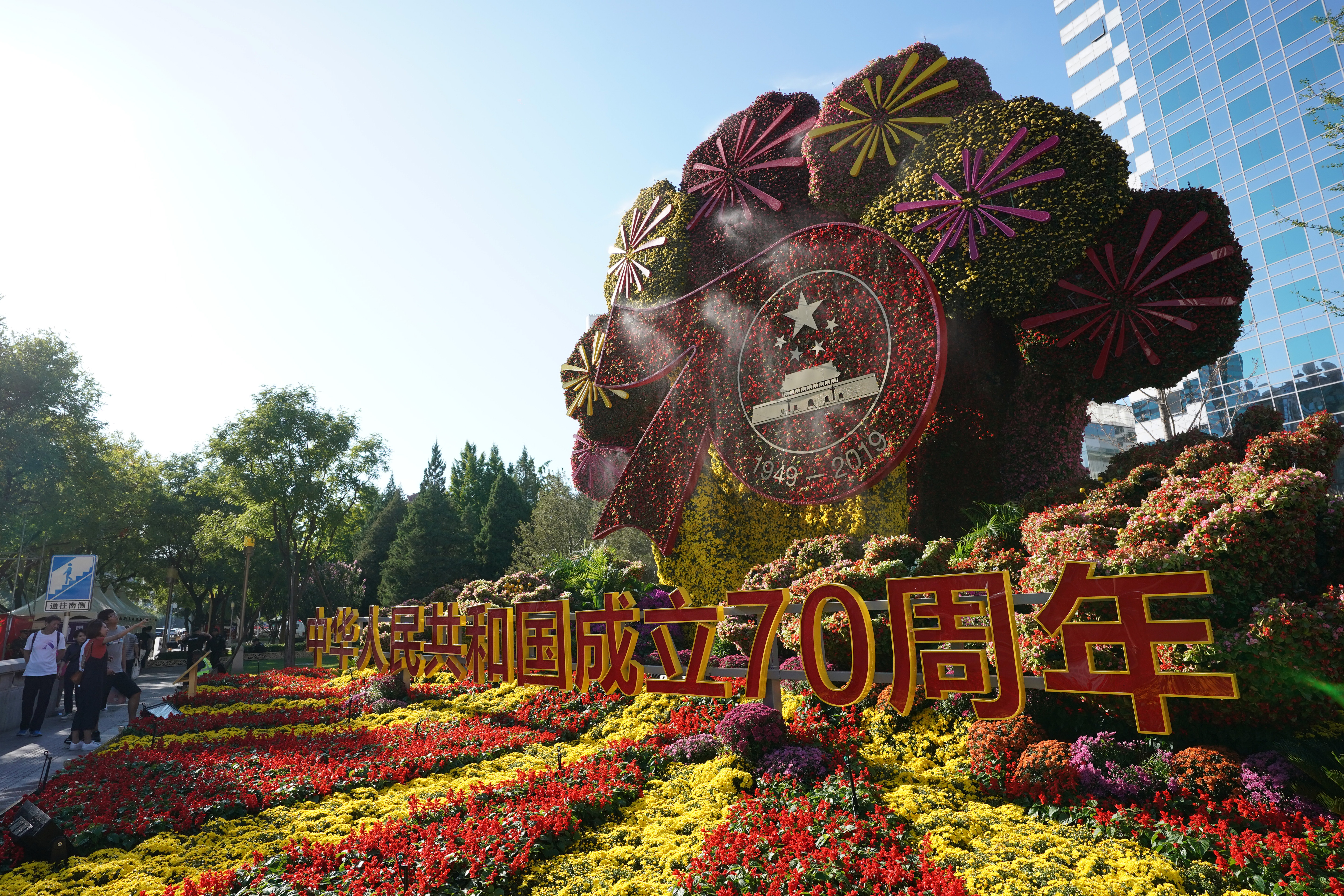People watch a flowerbed titled "70th Anniversary of the Founding of the People's Republic of China" in Beijing, capital of China, Sept. 23, 2019. Twelve flowerbeds were built along the Chang'an Avenue to celebrate the 70th anniversary of the founding of the People's Republic of China. (Xinhua/Ju Huanzong)