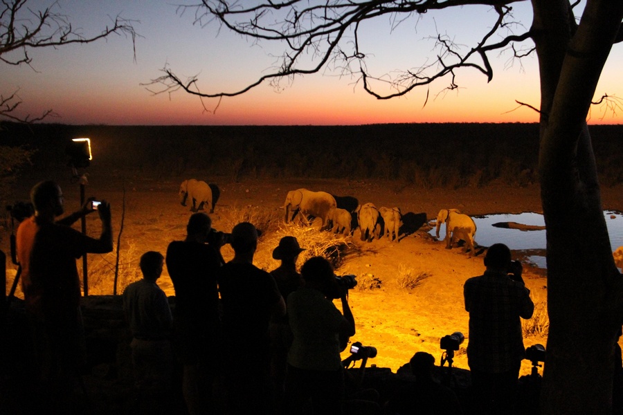 Visitors are watching elephants in a quarantine area in the Etosha National Park, northwestern Namibia, Aug. 26, 2016. (Xinhua/Wu Changwei)