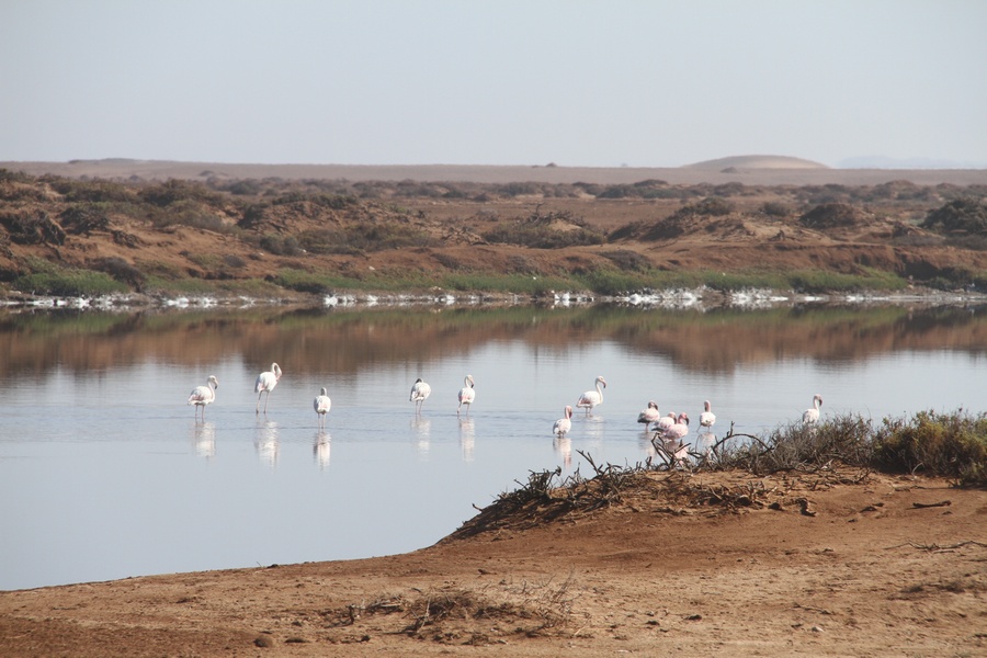 Flamingos feed in a lagoon in Skeleton Coast Park in Namibia, Sept. 7, 2014. Lying on the Atlantic coast west of Namibia, Skeleton Coast stretches about 500 kilometers from Swakop River in central Namibia up north to Kunene River between Angola and Namibia. The 20,000-square-kilometer area is known for harsh climate, outlandish landscape and various flora and fauna. (Xinhua/Gao Lei)