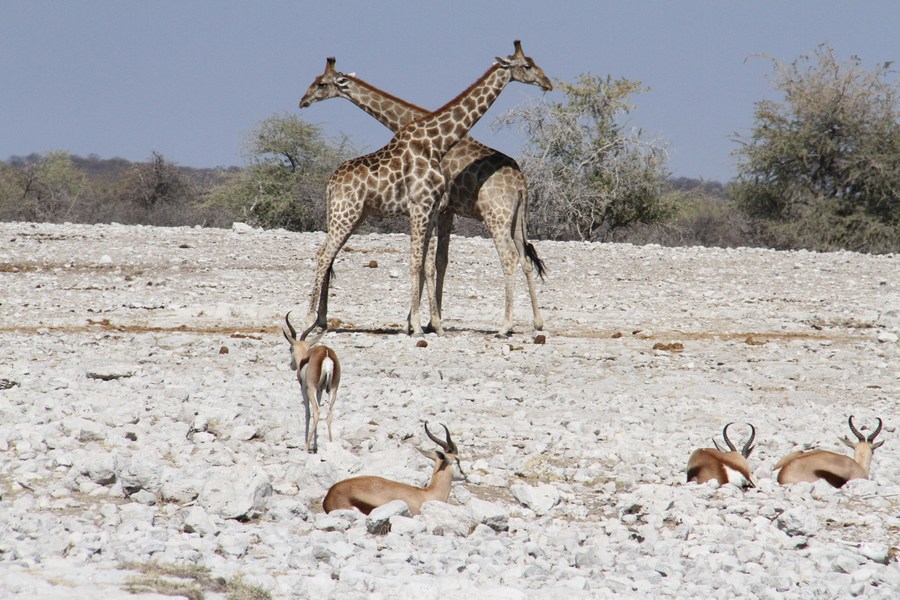 Giraffes and steenboks are seen at the Etosha National Park, northwestern Namibia, July 30, 2016. The park spans an area of 22,270 square kilometers and gets its name from the Etosha pan, a large salt pan. The park is home to hundreds of species of mammals, birds and reptiles. (Xinhua/Wu Changwei)