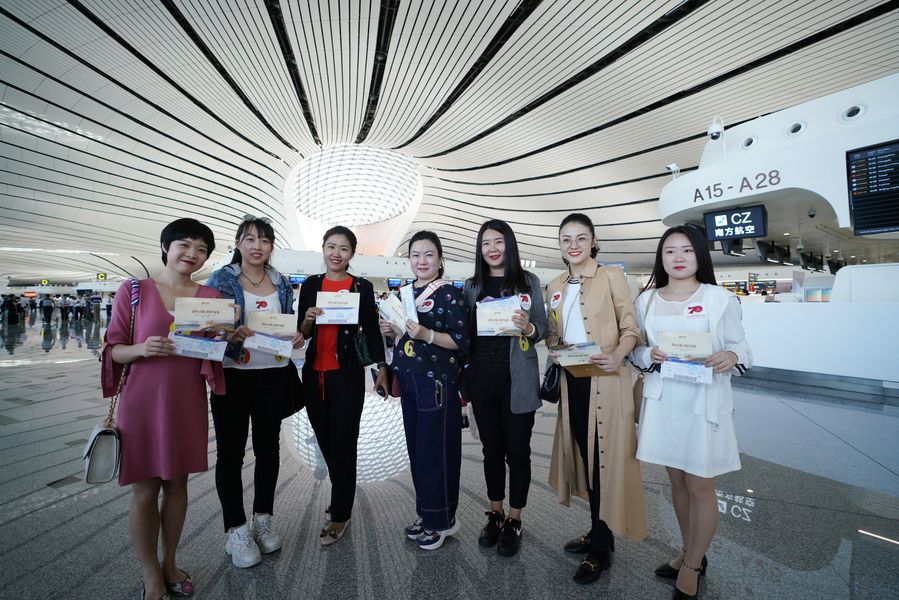 Passengers pose with boarding passes at the terminal of Daxing International Airport in Beijing, capital of China, Sept. 25, 2019. (Xinhua/Ju Huanzong)